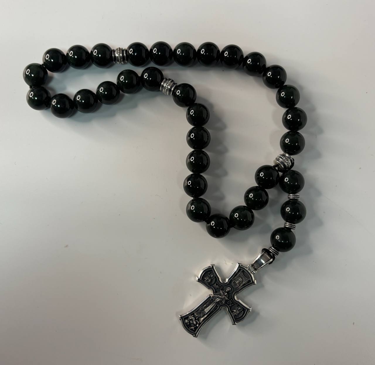 Бусины разделены тремя православными серебряными разделителями. Четки украшают серебряный православный крест "Якорь. Спас Нерукотворный. Морской". Размеры крестика: 52мм х 22мм х 3,5мм. Внутренние размеры ушка: 8 х 4,5мм.